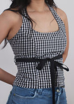 Breathable, tailored, and thoughtfully made. The top includes a removable ribbon, offering versatility in styling. Available in classic black and charming Gingham print.